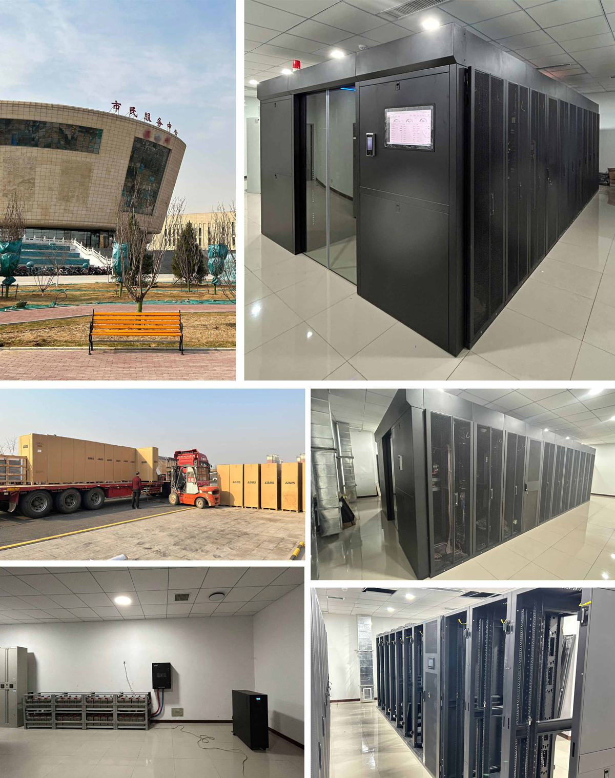某市市民服務中心 機房雙排模塊冷通道微模塊中心設計、施工,內搭載1臺列頭柜,2臺25kW列間空調,19個服務器機柜,外設1臺60kW UPS電源+電池組組合,擁有快速部署、高效節能、遠程管理等特點,滿足客戶在云時代對數據中心管理的需求。